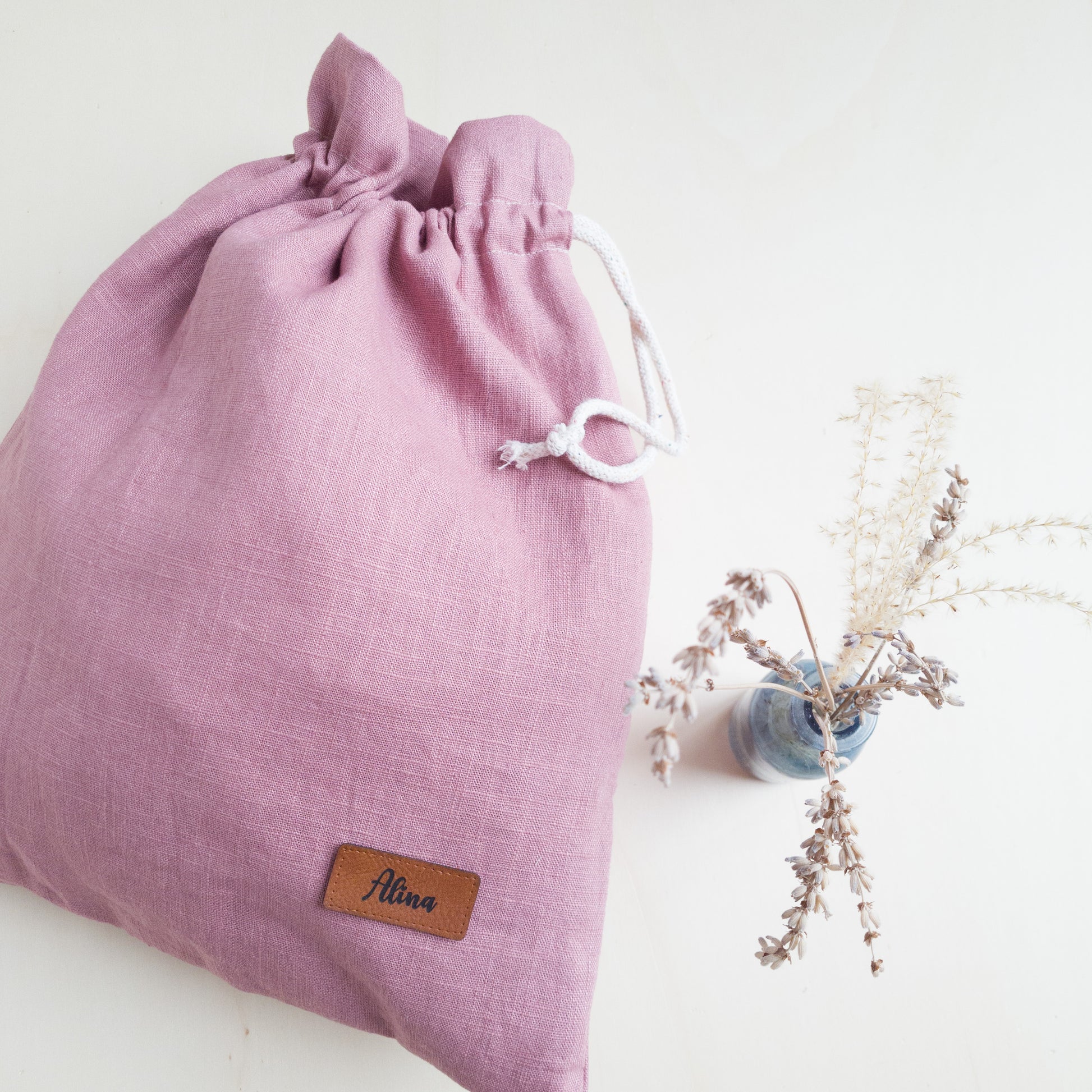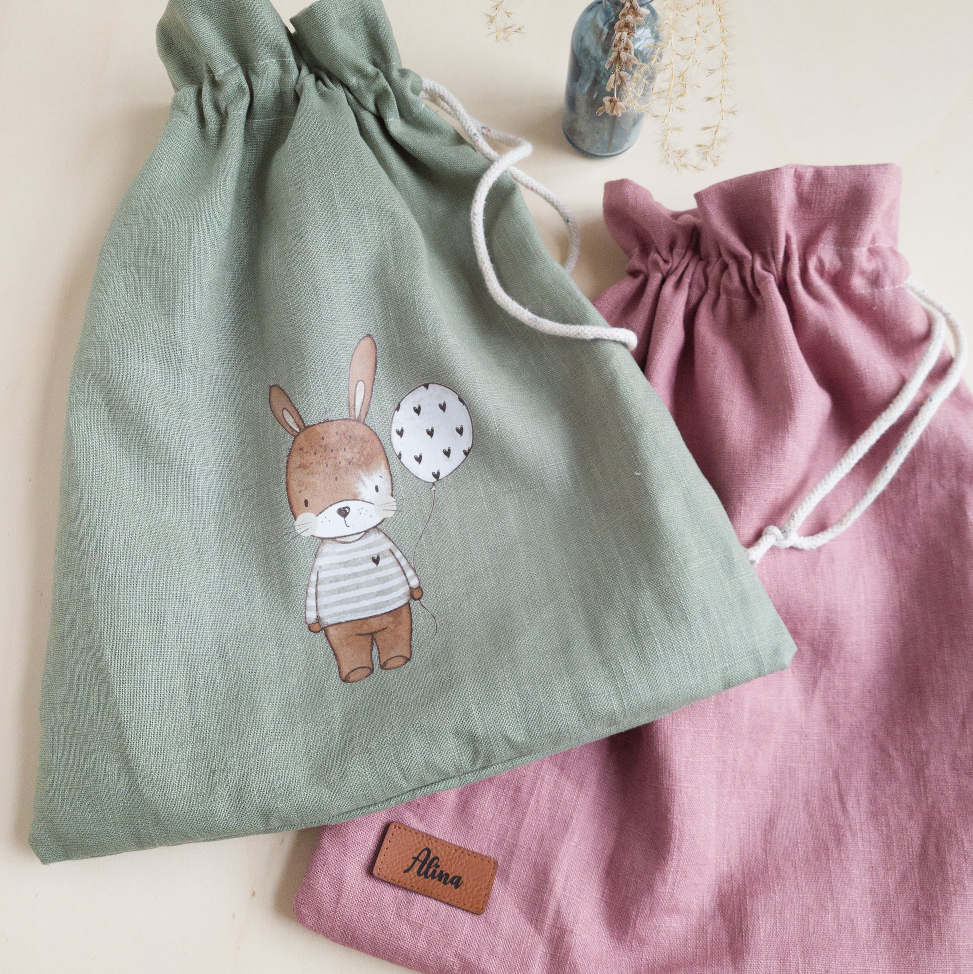 Nachhaltiger Geschenkbeutel mit Namen oder mit Ostermotiv. Der Stoffbeutel wird von mir aus 100 % Leinen genäht.