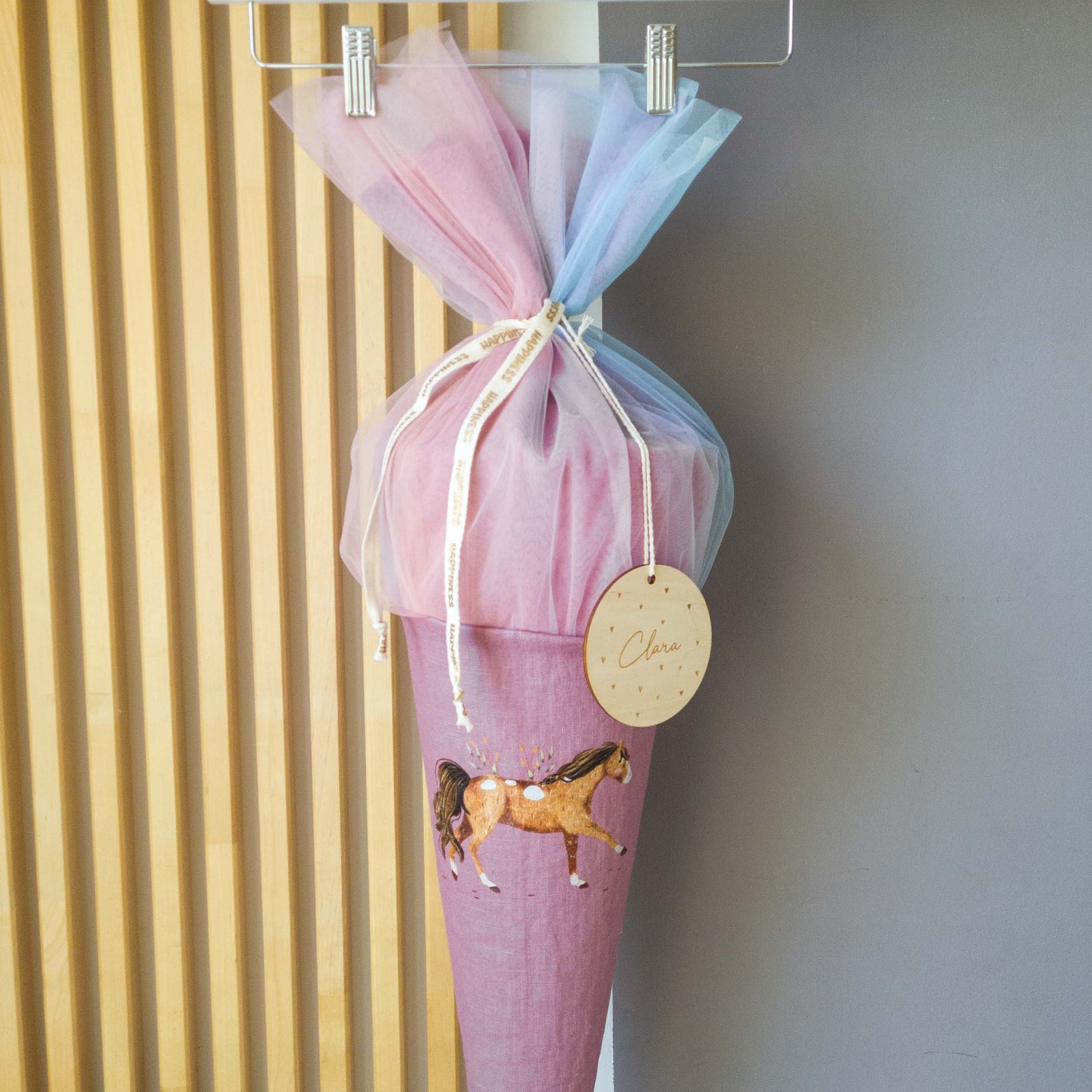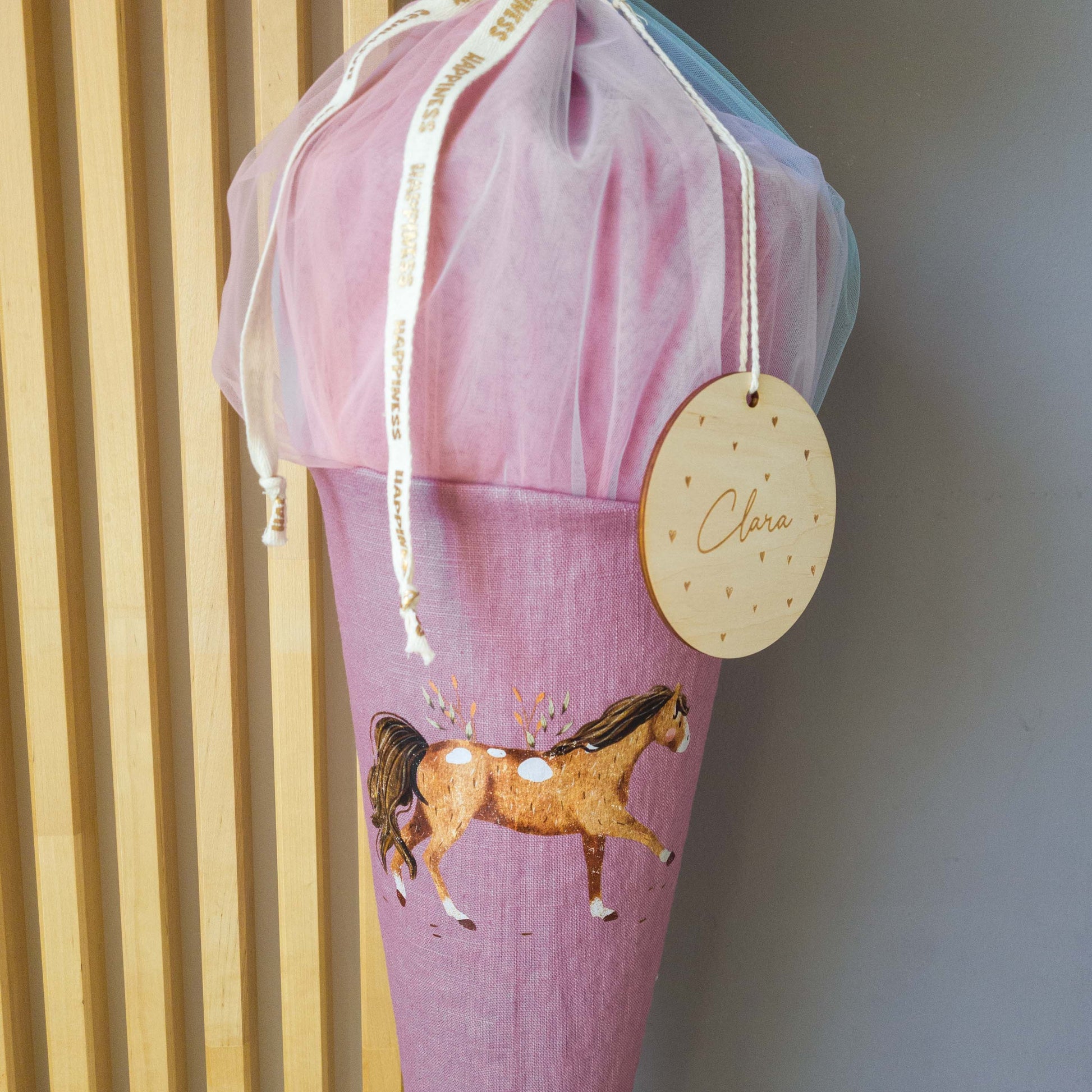 Diese Pferde-Schultüte wird Bibi & Tina-Fans begeistern. Sie ist aus Leinen (87 % Leinen, 13% Baumwolle) und wenn gewünscht Regenbogen-Tüll (Polyamid). Ihr könnt aus 4 wunderschönen Farben und drei Kordeln selbst wählen.